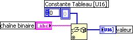 Utlisez le VI Redresser à partir d'une chaîne [Unflatten from string] avc comme type une constante tableau du type souhaité (ci-dessous, U16). Ce VI est diponibles dans la palette Numérique >> Manipulation de données.