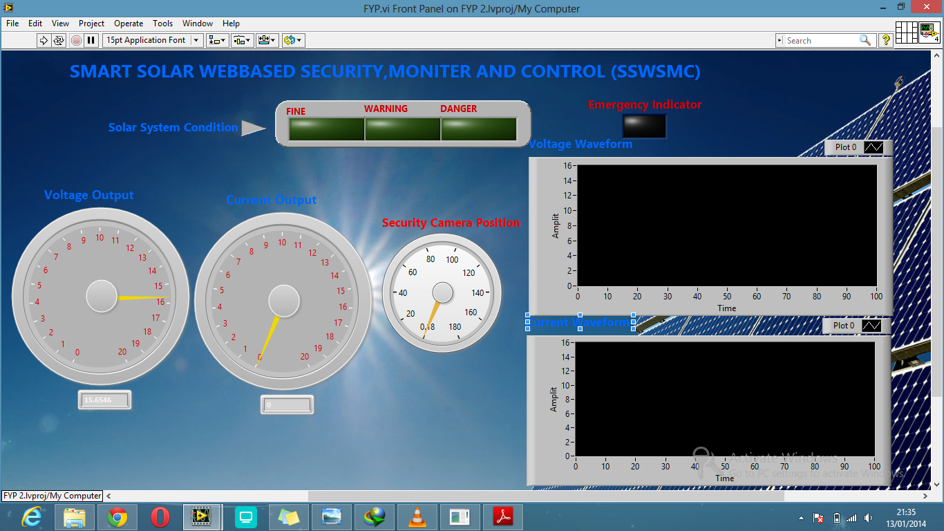 Second phase is about Real Time GUI based remote monitoring and controlling the solar system using LabVIEW, LabVIEW UI builder,Arduino and standard HTTP or TCP/IP protocol. By using LabVIEW webservices monitoring and controlling can be done. Monitoring includes power production, power consumption and power management using GUI interface. Controlling includes remote turn on/shutdown of solar system, remote switching to other available system such as wind energy system etc. (in case failure of solar system).GUI interface using Labview UI builder contains power meters, power production and consumption graphs, indicator LEDs etc.“Solar system on web” can be accessed from any device that support HTTP protocol and controlled by authorized person. Using live online streaming camera solar security can be ensured by using Ustream(ustream.tv ) broadcasting services. Implementation of this project will benefit in terms of protection, operation, monitoring and maintenance of solar systems.