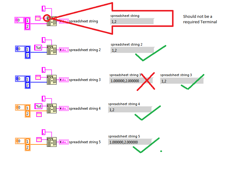 I am extensively using the Array to Spreadsheet string Primitive and most of the time I never used the Format string input (Use to wire an empty string constant) and still I am getting the right result what I expect. So I think it would be better if the Required Terminal is changed to an Optional Terminal.