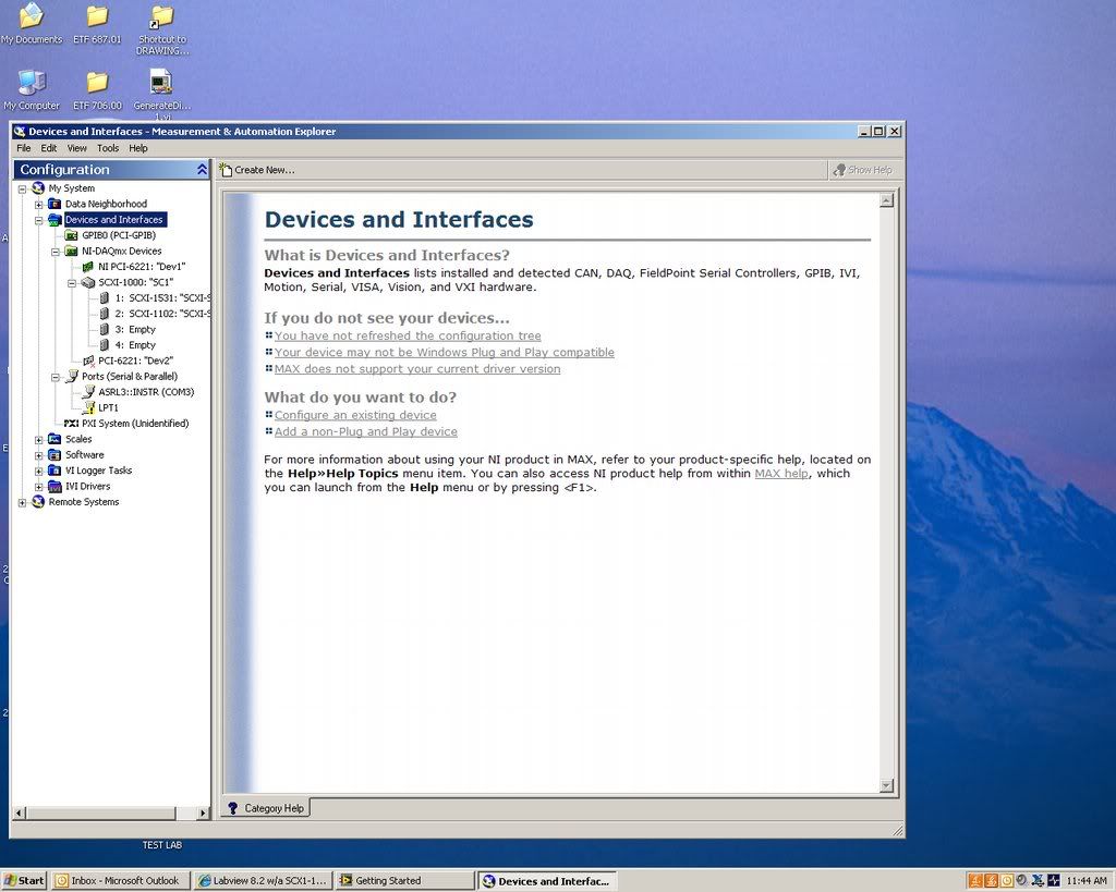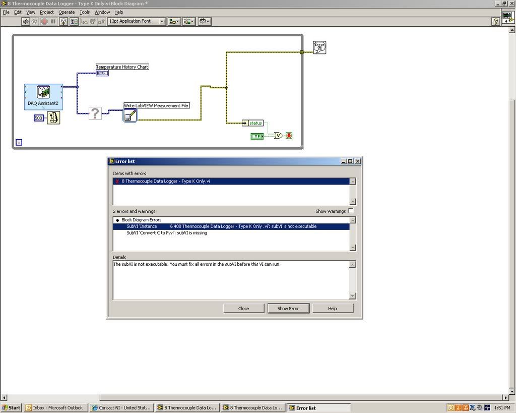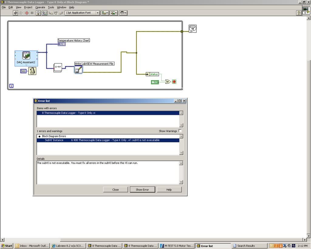 I am trying to monitor temperatures using thermocouples (type k).  The thermocouples hook-up to a NI SCX1-1000.  To resolve issues with another program that ran off of national instruments runtime engines I had to uninstall labview.  I recently re-installed labview 8.2.  I can open up old files that were saved, but the code doesn't work anymore.  I do not know how to fix the code.  I have tried using the labview help link, and following a tutorial, but it has not been much help.  This is what the error message and the code look like: