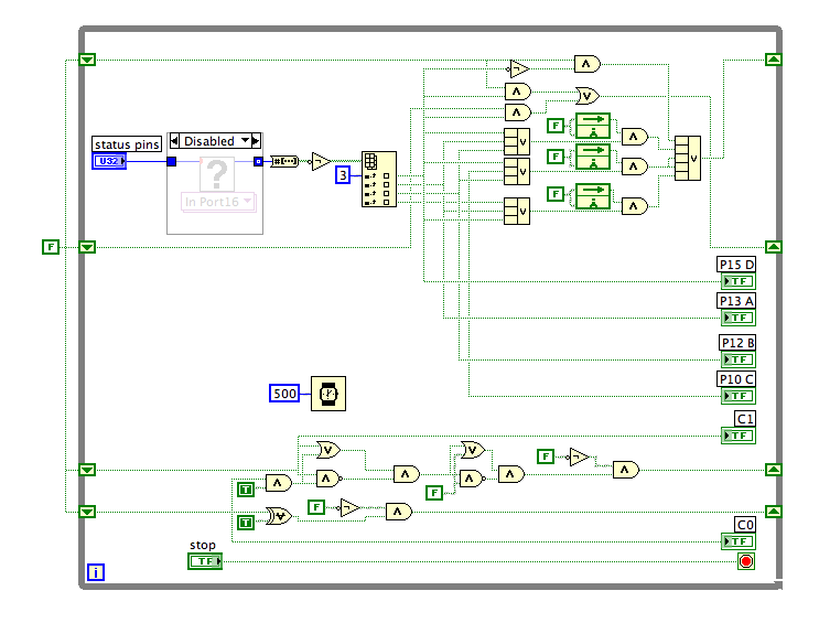 Here is how it looks after I cleaned it up a bit. I deleted the feedback nodes which were not connected to anything. I disabled the In Port.vi because it is not available on my platform. I replaced the feedback nodes with shift registers, not because there is any problem with them, just that I am more comfortable with shift registers. I also simplified the number to boolean array to individual booleans after altenbach's suggestion. There are probably additional changes which might simplify things further.